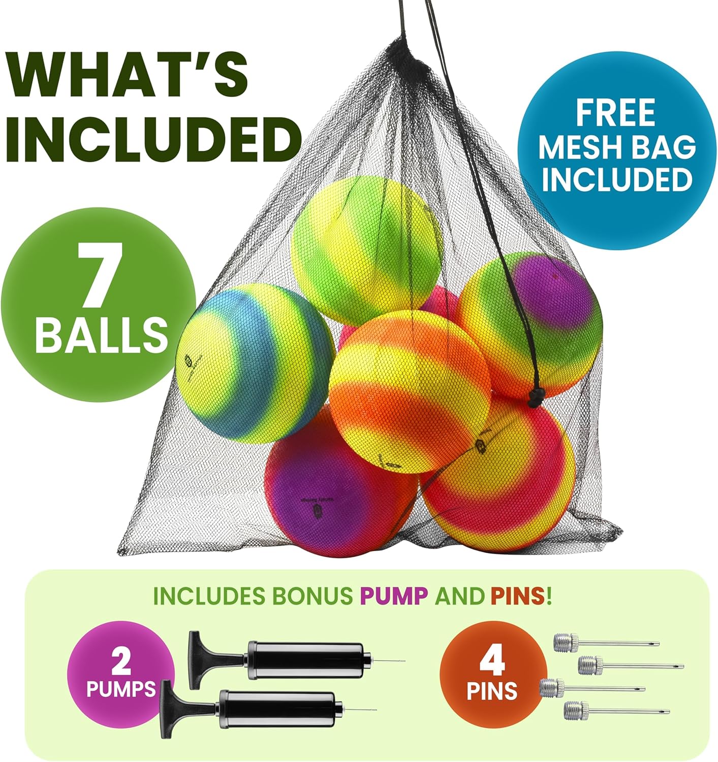 ★ [SET OF 7 BALLS WITH ACCESSORIES] – You will have a ball for all your games with this rainbow playground balls set of 7 that comes with a MESH BAG that can hold all the balls when fully blown up, 4 PINS, and 2 PUMPS to help you fill air easily.